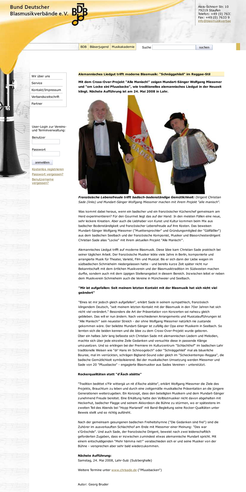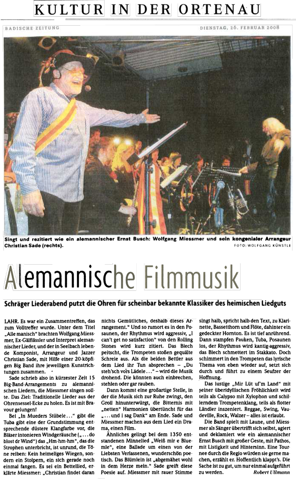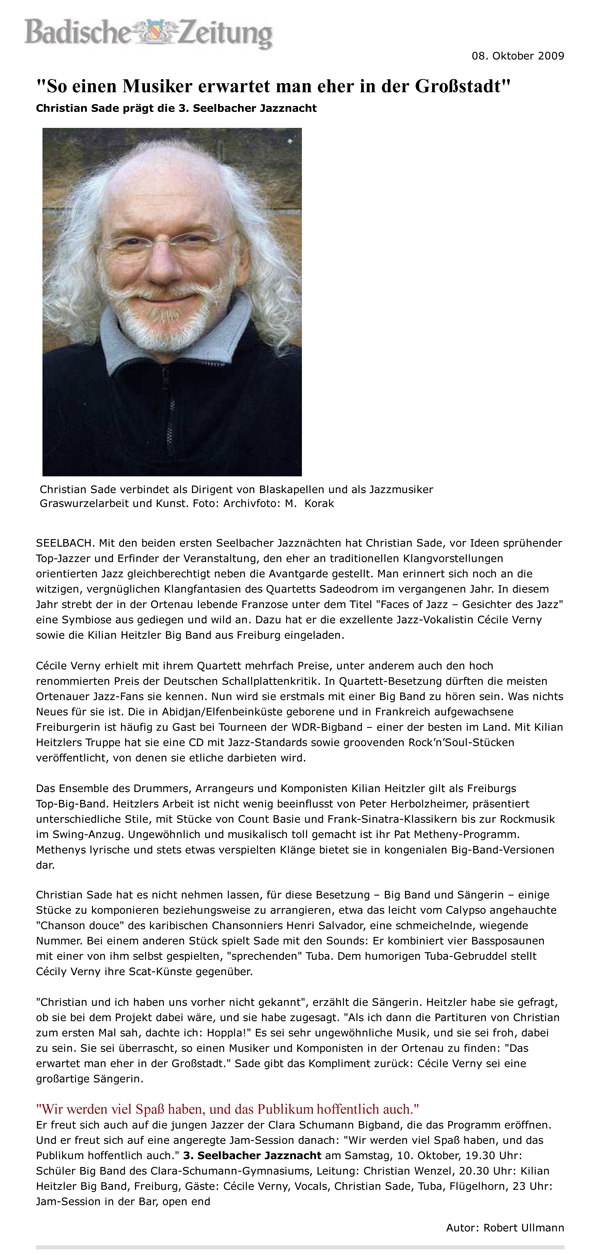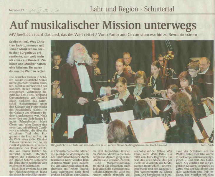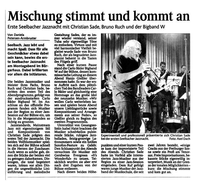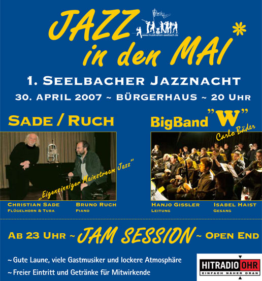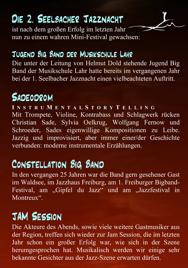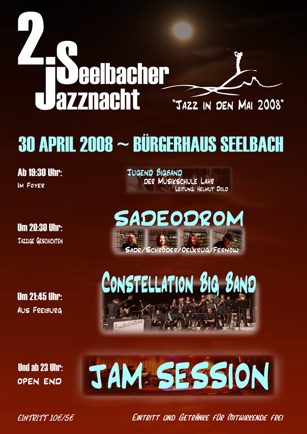 | 2008 Das zweite "Bläsical" wurde im April 2008 aufgeführt "Planet Baden", und in Juni nochmals als Benefizveranstaltung. Und am 1. Mai fand die zweite Ausführung der "Seelbacher Jazznacht" statt, mit der für diese Gelegenheit kreierte "IntruMentaStoryTelling" Formation "Sadeodrom" und die "Constellation Big Band". |