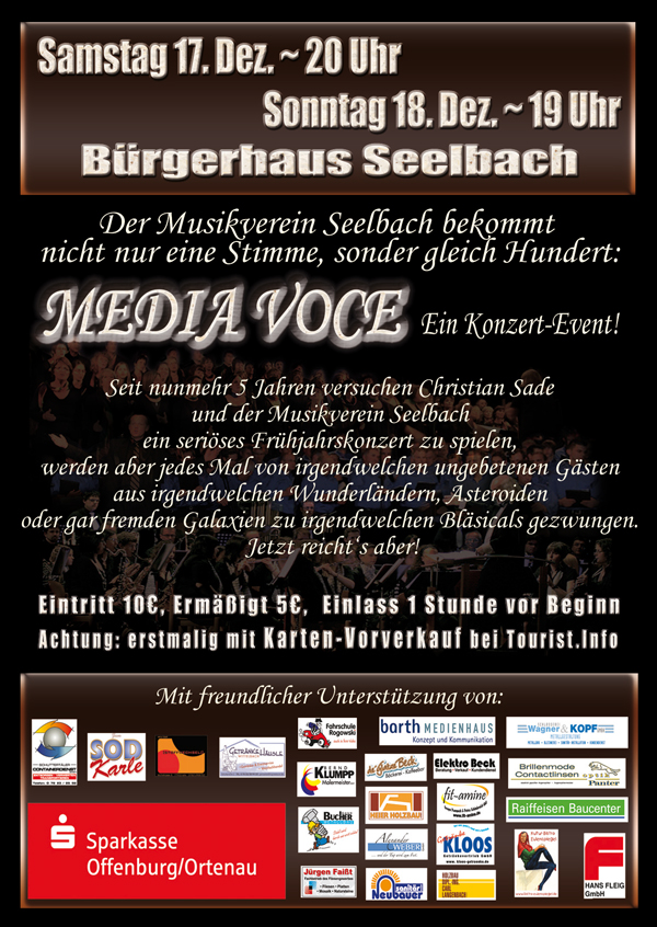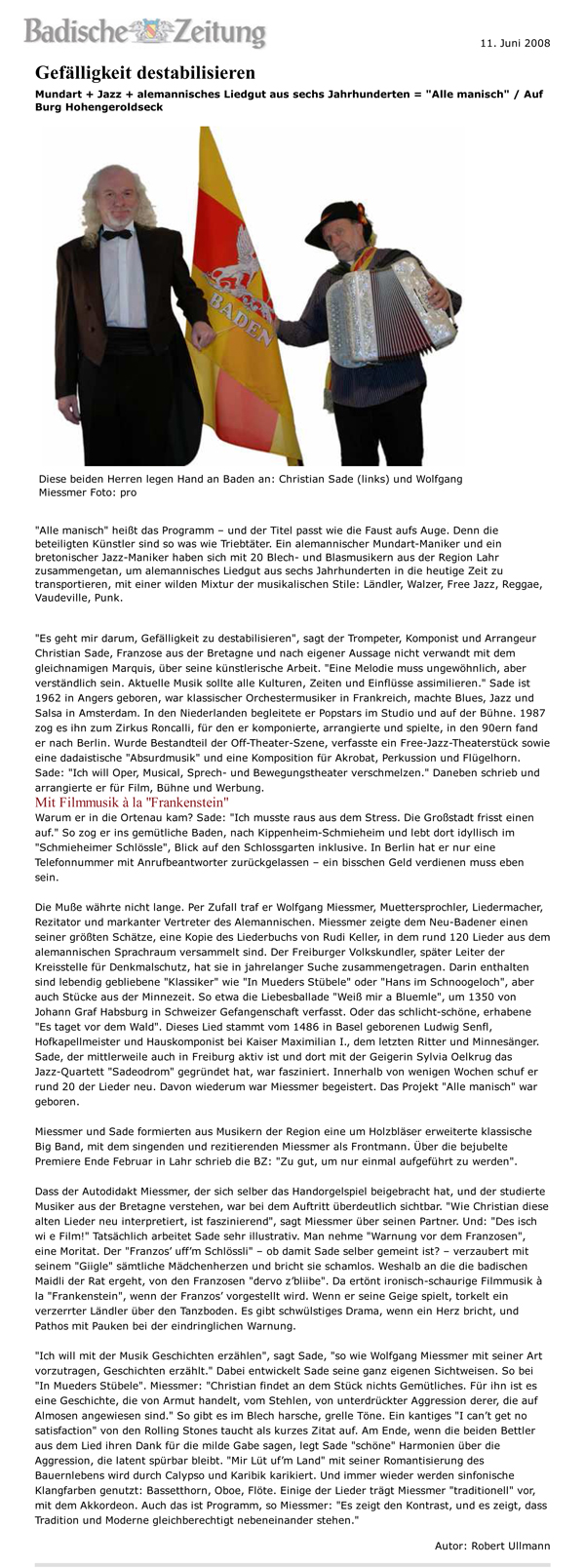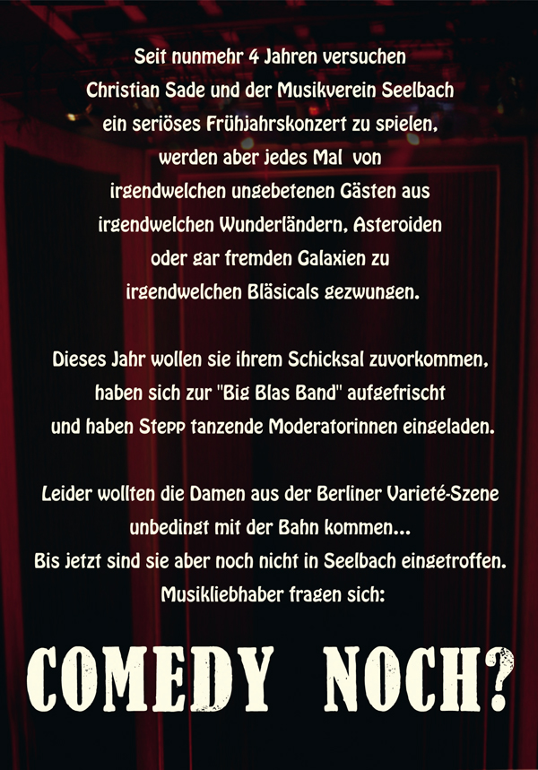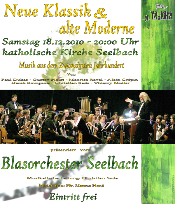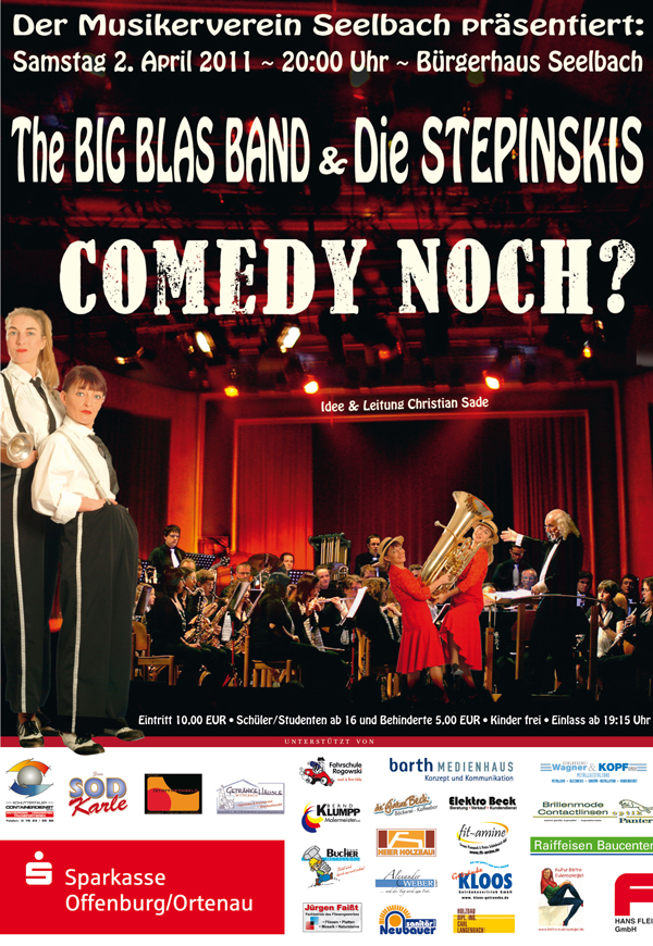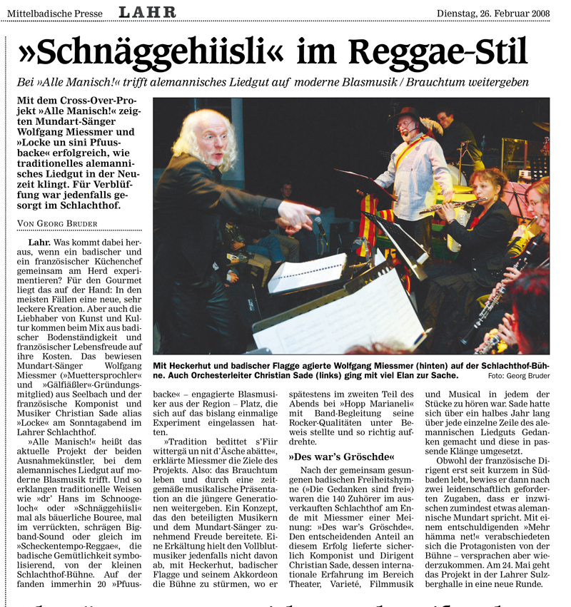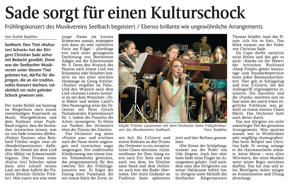 | 2008 Das zweite "Bläsical" wurde im April 2008 aufgeführt "Planet Baden", und in Juni nochmals als Benefizveranstaltung. Und am 1. Mai fand die zweite Ausführung der "Seelbacher Jazznacht" statt, mit der für diese Gelegenheit kreierte "IntruMentaStoryTelling" Formation "Sadeodrom" und die "Constellation Big Band". |