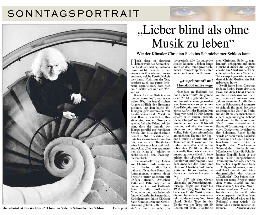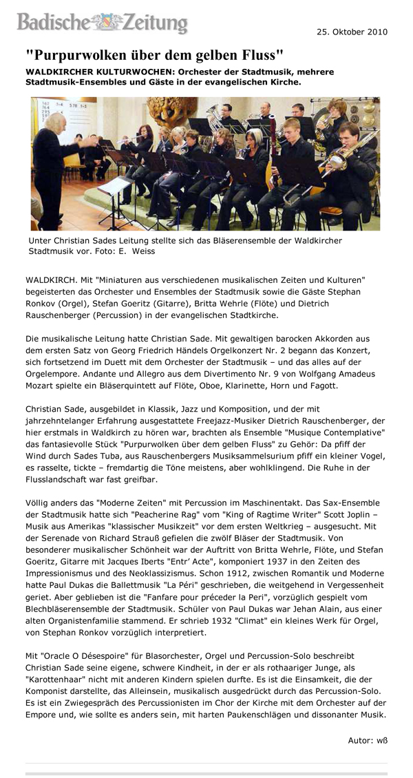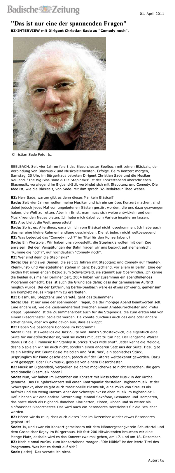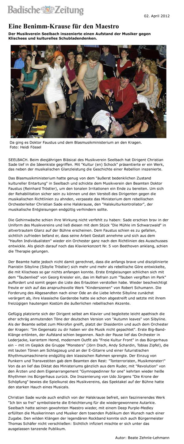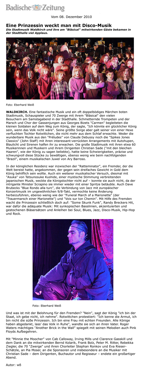 | 2008 Das zweite "Bläsical" wurde im April 2008 aufgeführt "Planet Baden", und in Juni nochmals als Benefizveranstaltung. Und am 1. Mai fand die zweite Ausführung der "Seelbacher Jazznacht" statt, mit der für diese Gelegenheit kreierte "IntruMentaStoryTelling" Formation "Sadeodrom" und die "Constellation Big Band". |