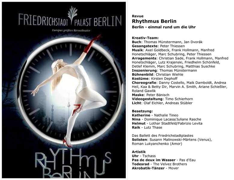 | Und im Herbst gab mir der berühmte "Friedrichstadtpalast Berlin" einige Arrangements und Orchestrierungen für ihre Produktion "Rhythmus Berlin" in Auftrag. |