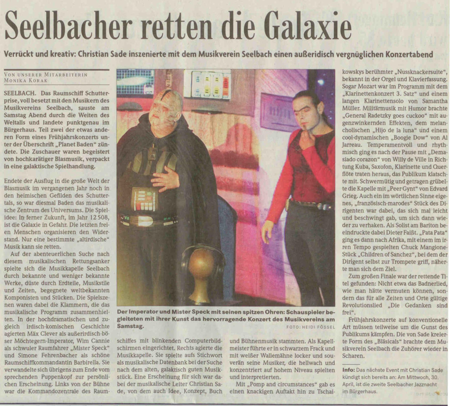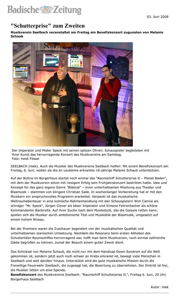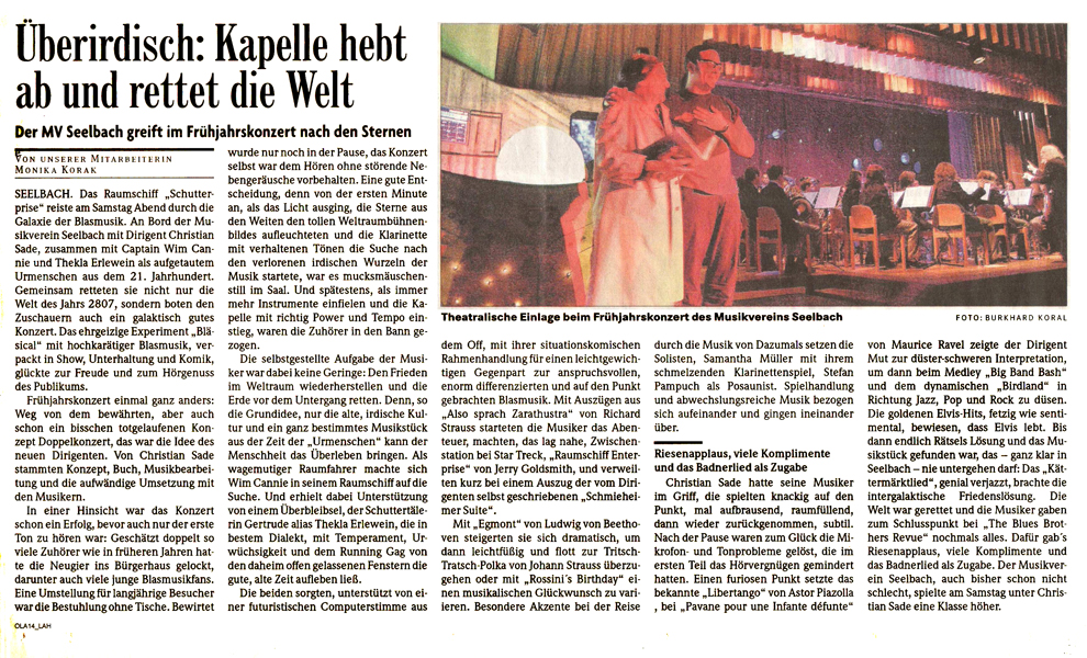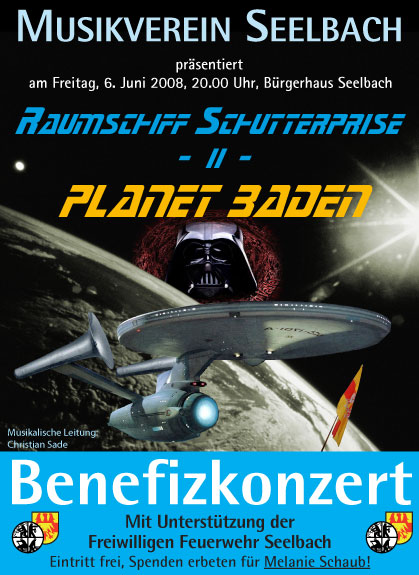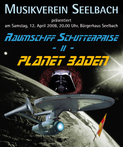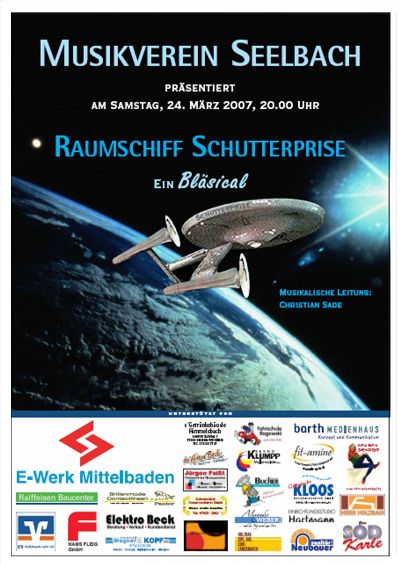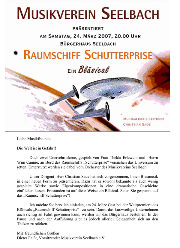 | 2007 entstand mit dem Musikverein Seelbach das erste "Bläsical" der Welt, "Raumschiff Schutterprise", eine Science Fiction Parodie, bei welcher eine Seelbacherin die ganze Galaxie rettet. Auch erstmalig, live gespielte Bühnenmusik, die während den Dialogen und Theaterszenen das Geschehen untermalte. |