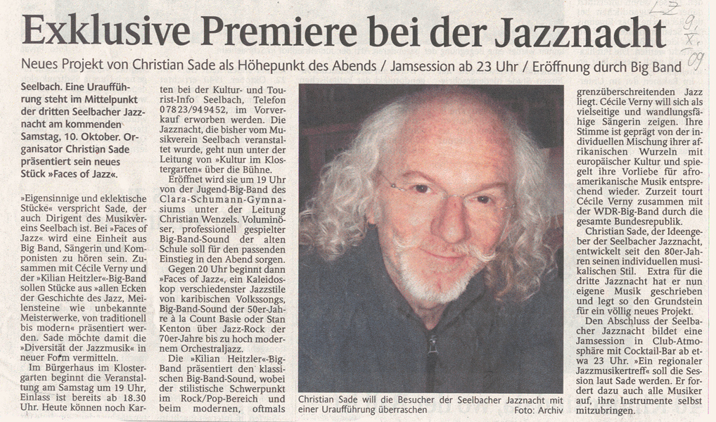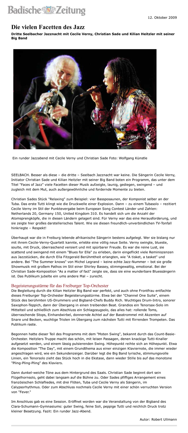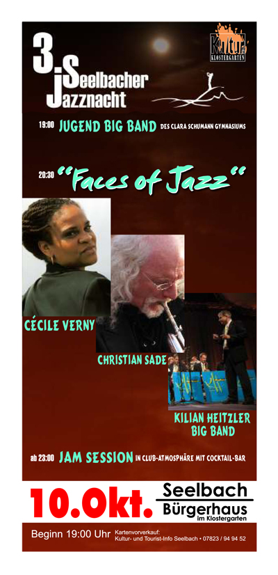 | Im Herbst fand die dritte "Seelbacher Jazznacht" statt. Zentraler Teil dieses Festivals war einen Konzept-Konzert für die Kilian Heitzler Big Band, die Jazz-Sängerin Cécile Verny und einen Flügelhornist-Tubisten (ich selbst). |