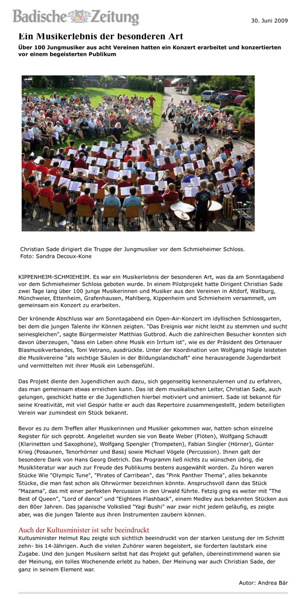 | Im Juni übernahm ich die Leitung eines Jugend Projektorchesters, zusammengesetzt aus acht Musikvereinen aus der Ortenau, mit über 100 Jugendlichen. Das Konzert fand in Schmieheim vor dem Schloss statt. Im Herbst entstand mit dem Musikverein Schmieheim ein außergewöhnliches Doppel-Konzert mit dem Musikverein Altdorf. |