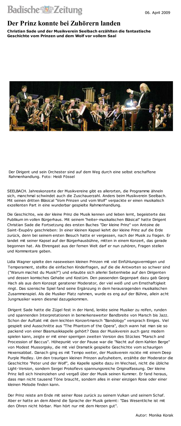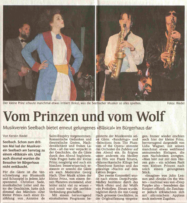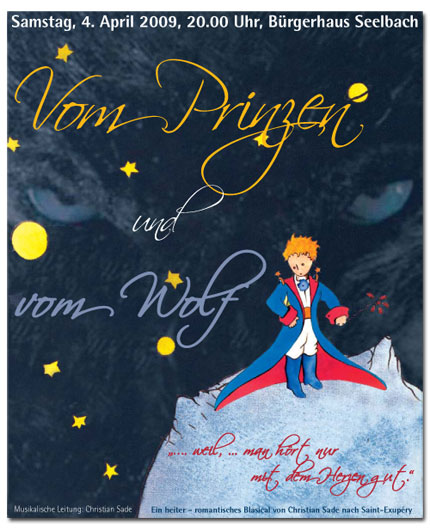 | 2009 wurde das dritte Bläsical uraufgeführt "Vom Prinzen und vom Wolf", welches die Geschichte erzählt, wie der Kleine Prinz nochmals auf die Erde kommt um nach dem Sinn vom Musikspielen zu fragen. |