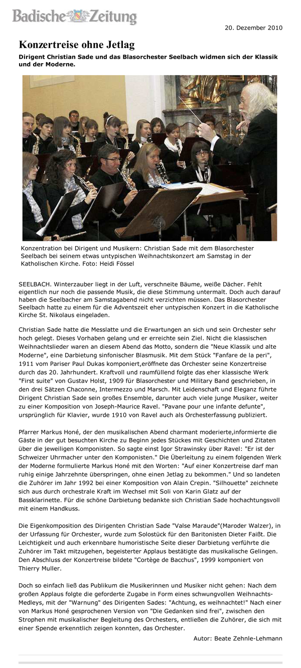 | 2006 übernahm ich die musikalische Leitung für Produktionen der GOP-Varietés und des Chamäleon-Varieté, komponierte "2020, Komm auf Tour", die Musik für den gleichnamigen Videoclip im Auftrag des Landes NRW, und "Les Séances", eine Suite für Blechbläserquintett, uraufgeführt am 13. September im Museum für Kommunikation Berlin. Mitte des Jahres siedelte ich nach Baden-Württemberg um und übernahm zunächst drei Dirigentenstellen bei den Blasmusikvereinen Schmieheim, March-Buchheim und Seelbach. | |