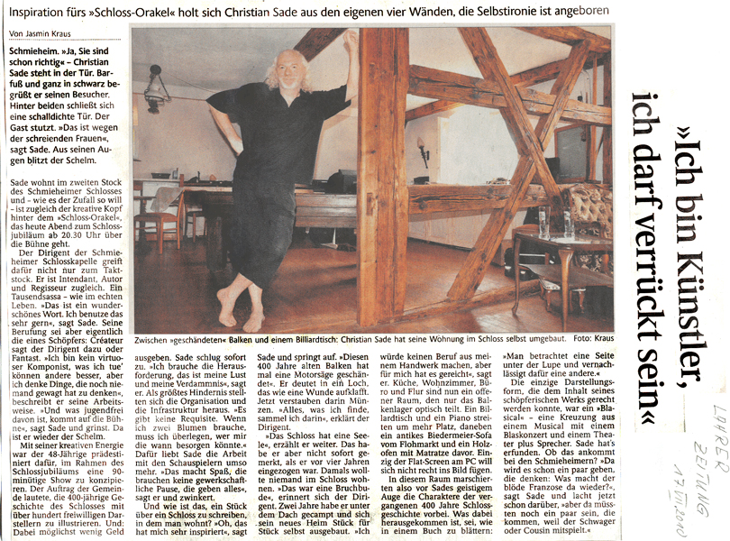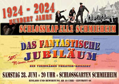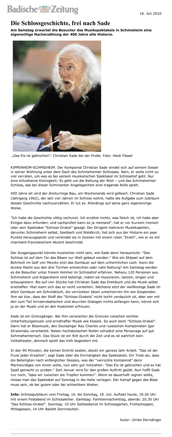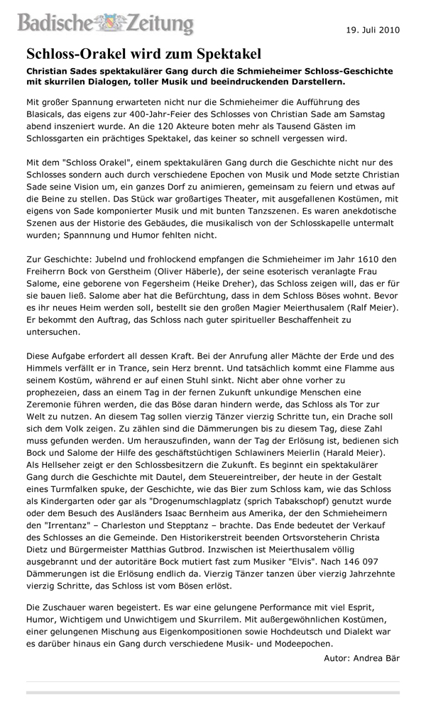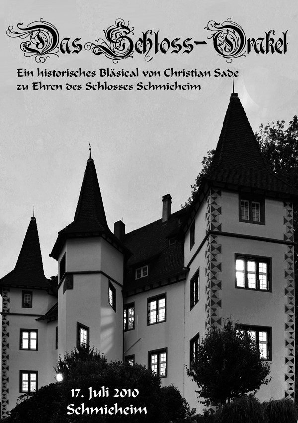 | Im Auftrag der Gemeinde Kippenheim zum 400 jährigen Jubiläum des Schmieheimer Schlosses durfte ich Konzept, Text und Musik schreiben, sowie Regie führen bei einem Spektakel mit 120 Akteuren, welches ich "Das Schloss-Orakel" nannte. |
