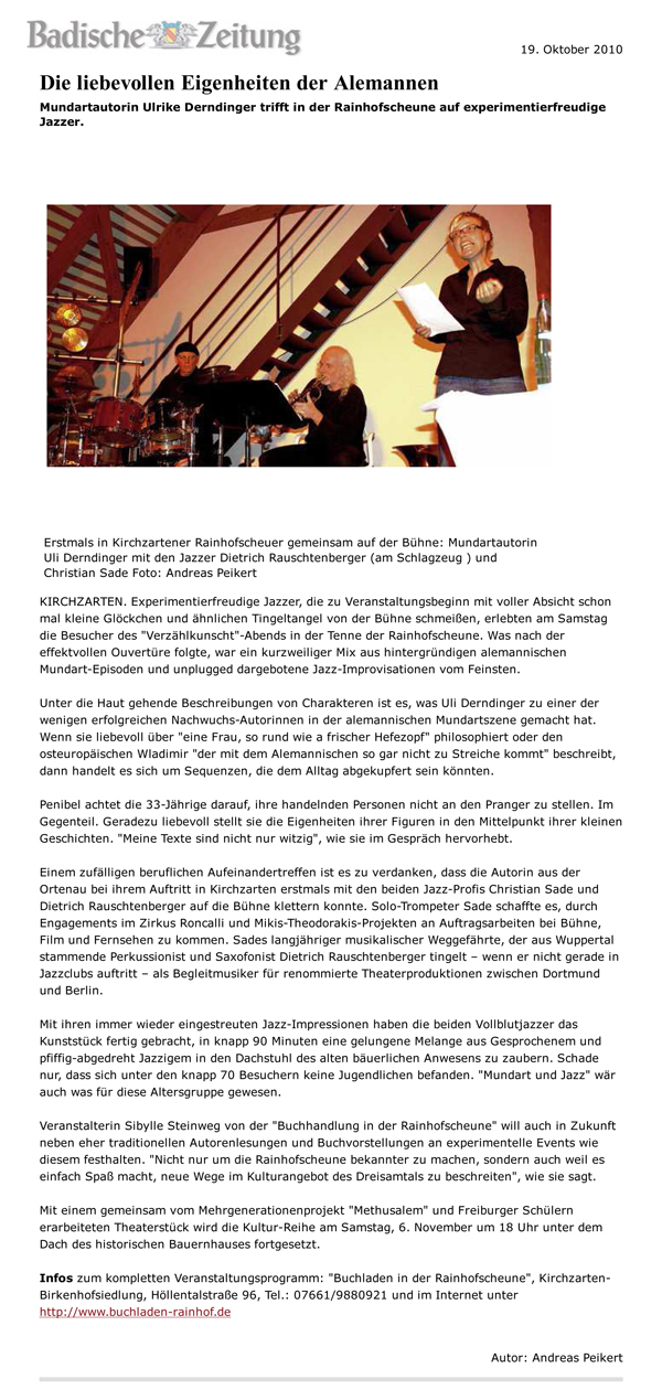 | Ganz außerhalb der Blasmusik konnte ich ein sehr schönes klein-aber-feines Freejazz- und Literaturprojekt mit Ulrike Derndinger und Dietrich Rauschtenberger machen: "Verzählkunscht" |