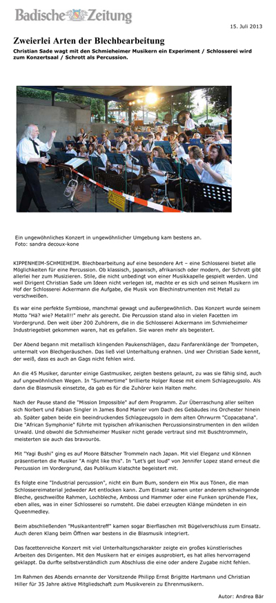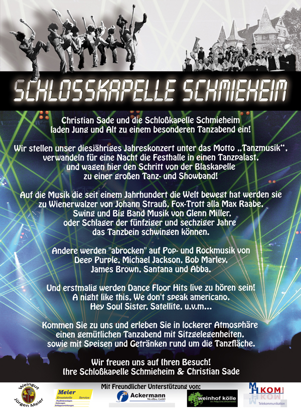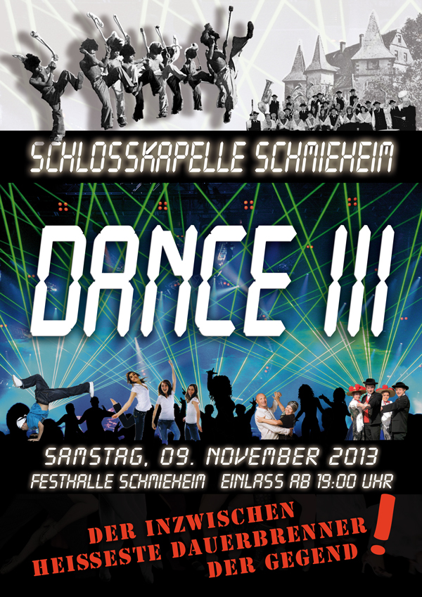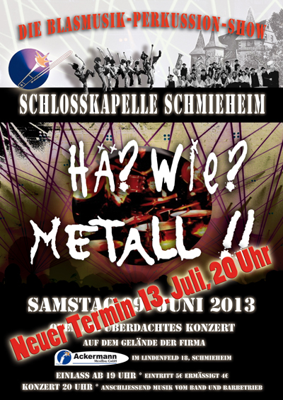 | In Schmieheim wurde "Hä? Wie? Metall!", eine Konzert-Performance mit viel Perkussion im Industriegebiet in den Hallen einer Schmieheimer Metall-Firma aufgeführt und im November Dance III, die dritte Aufführung des Tanzabends, wie immer live vom Musikverein gespielt. |