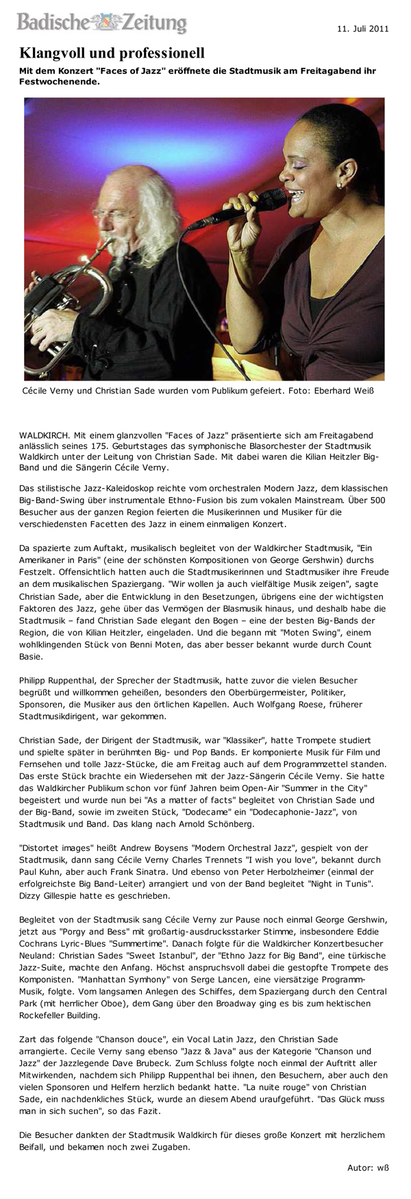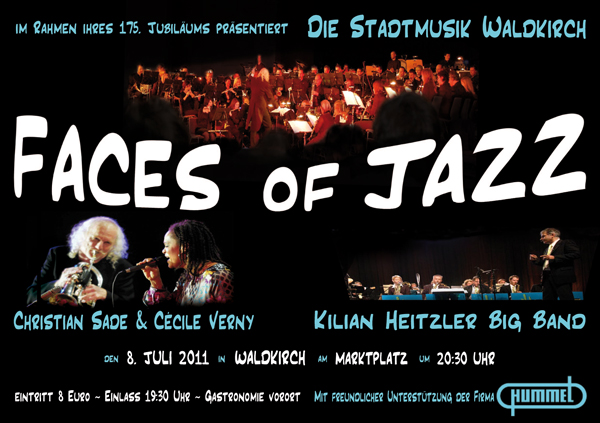 | In Waldkirch war nebst Festlichkeiten zum 175 jährigen Jubiläum der Höhepunkt des Jahres das Großkonzert "Faces of jazz" mit Cécile Verny, dem Symphonischen Blasorchester der Stadtmusik und der Kilian Heitzler Big Band. |