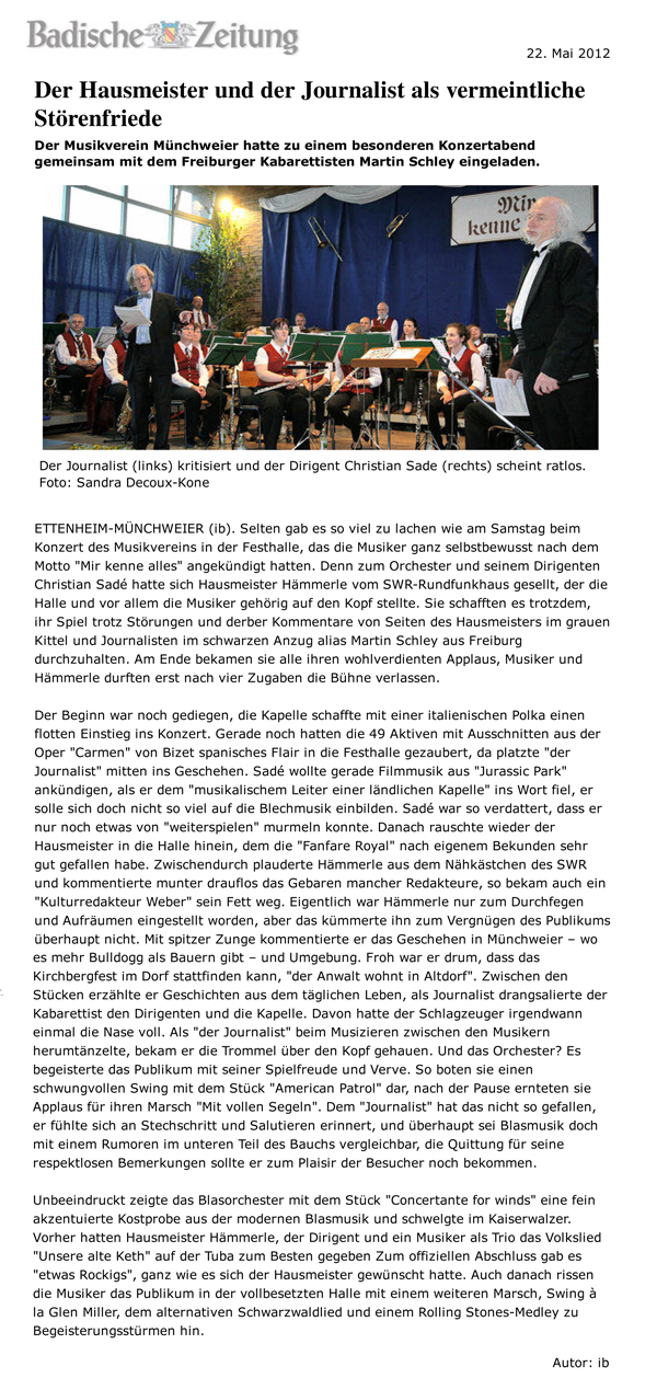 | Und in Münchweier war der SWR-Kabarettist Hausmeister Hämmerle zu Gast, um endlich aufzuräumen und böse Journalisten zu verscheuchen. |