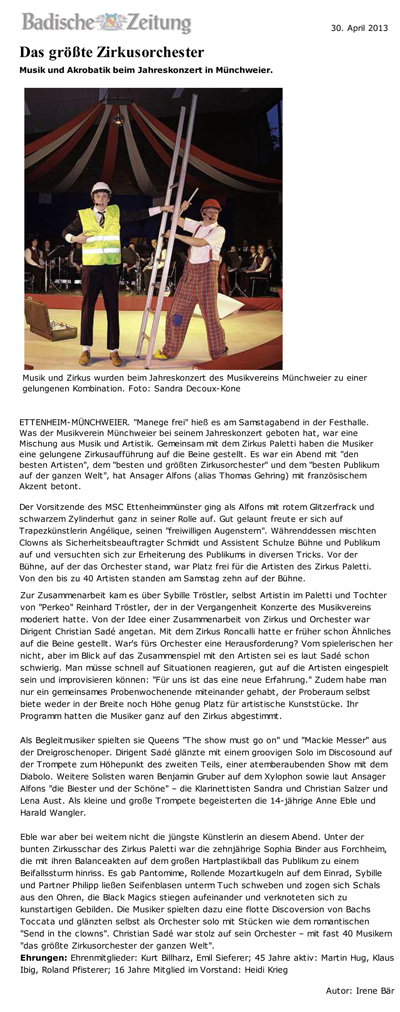 | 2013 entstand in Münchweier mit "Blasmusikzirkus" eine große Zirkus - Show mit dem Amateur-Zirkus "Zirkus Paletti". |