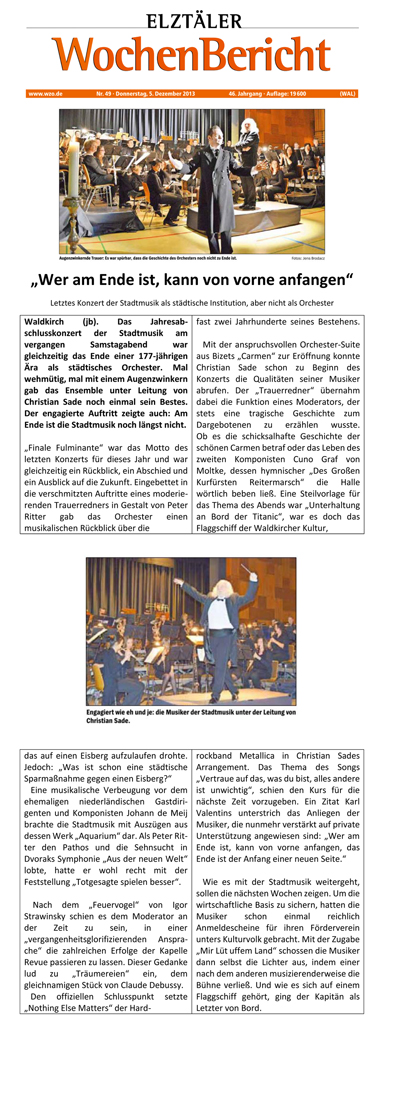 dem Musikverein Kollnau, im Juli ein locker-rockiges Open-Air-Sommerkonzert mitten in der Stadt, und im Dezember die Stadtmusikretrospektive mit schwarzem Humor "Finale Fulminante". |