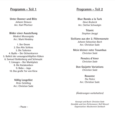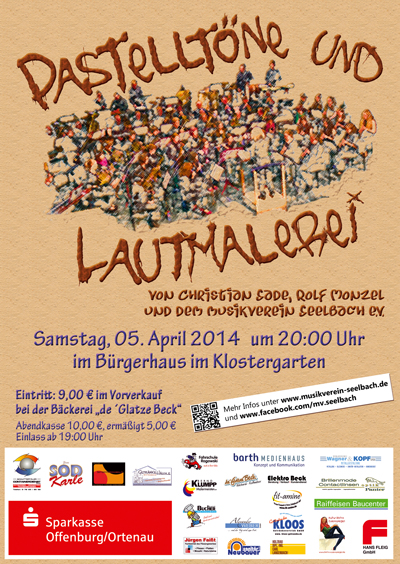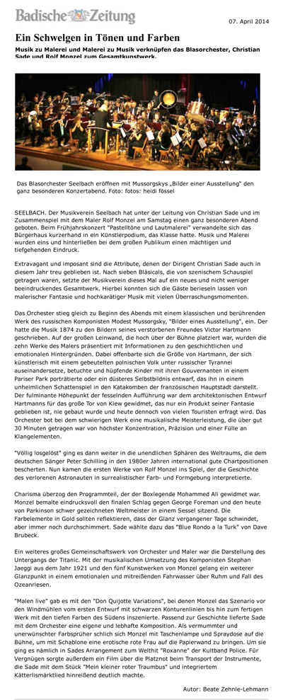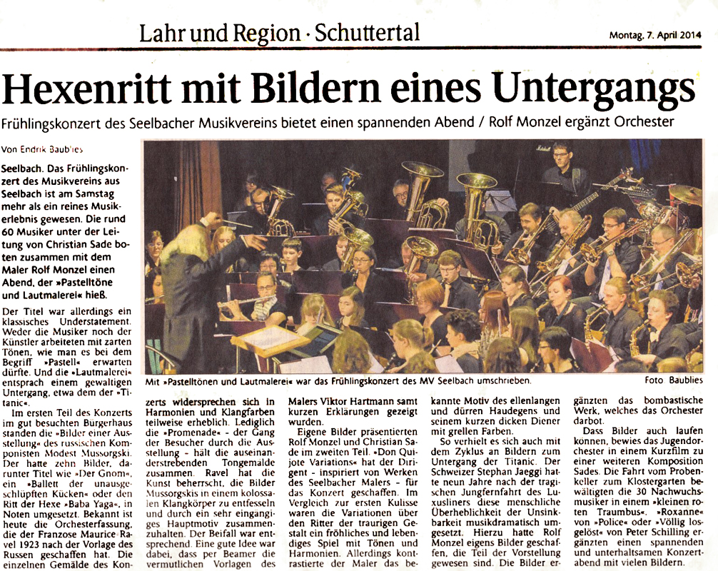 | 2014 Im April fand in Seelbach eine außergewöhnliche Mischung aus Ausstellung und Konzert statt: "Pastelltöne und Lautmalerei", bei welcher unter anderem die vollständige Fassung von "Bilder einer Ausstellung" aufgeführt wurde und dabei stehende, gefilmte und live gemalte Bilder live begleitete. |